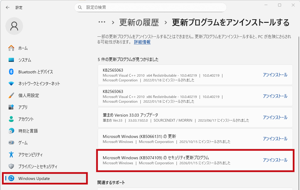 1/14に配信されたWindows Updateのプログラム(KB5074109)アンインストール後、症状が出なくなりました。